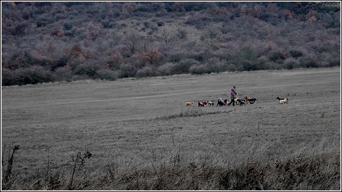 Harmadszor látom ezt a párt a rét közepén bandukolni (kb.) tizenöt kutyájukkal.