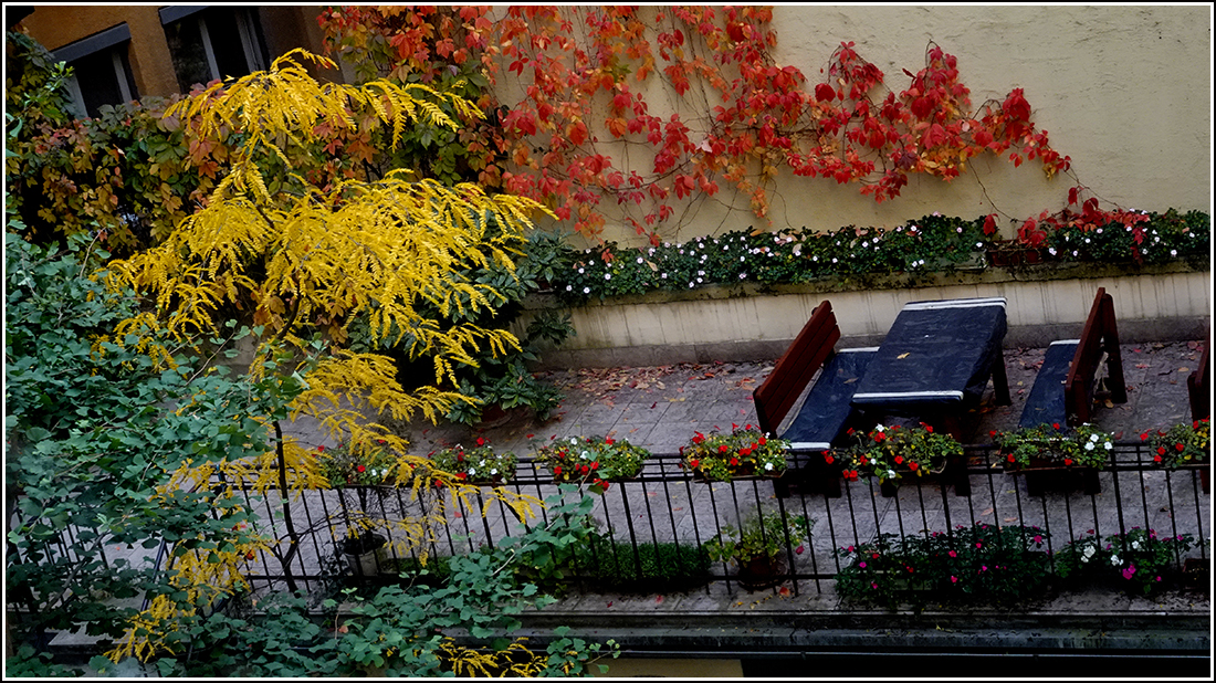 Ez már az ősz. Udvarunk a második emeleti lépcsőházablakból. A gyalog föl ajándék.