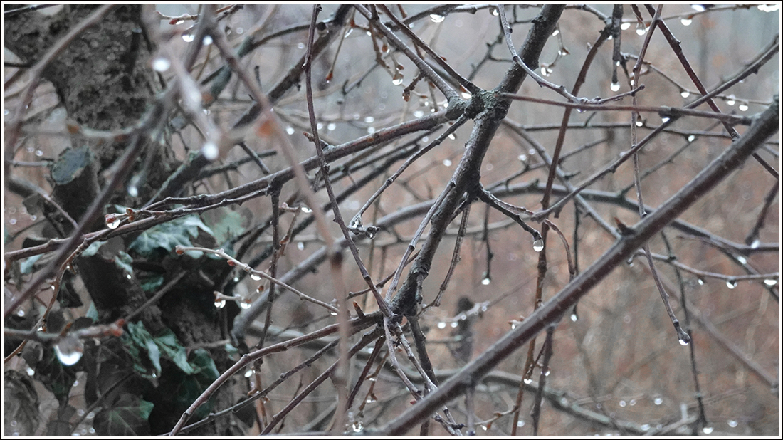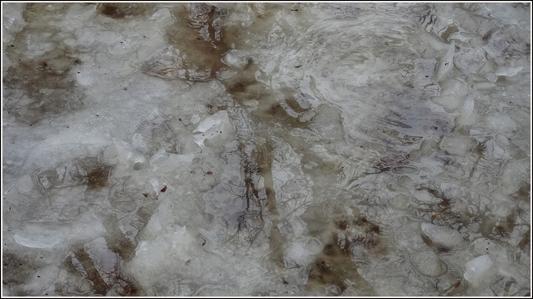 Lent jég, föntről esik. Vízcsöppek, lábnyomokban tócsák, töredékesen tükrözik